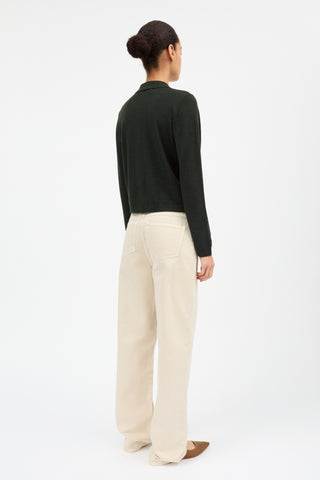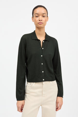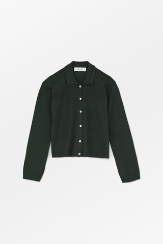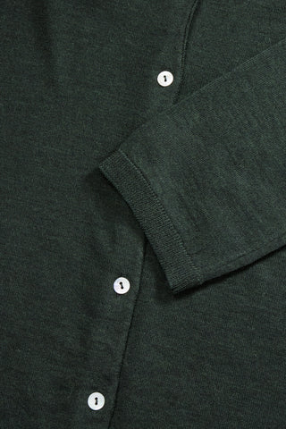 Amethyst Cardigan is a classic polo-shirt style cardigan in light merino wool. It has slightly dropped shoulders and fastens by six mother of pearl buttons down the front.