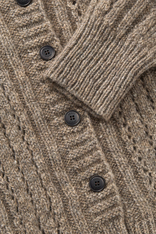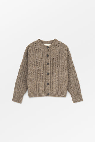 Dagmar Cardigan has delicate lace pattern details, a boxy fit, and is made from 100% wool. The wool is both spun and knitted in Denmark to support local production. The cardigan has a round neckline and closes with buttons.