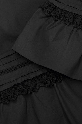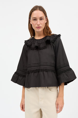Lulu Blouse is a feminine, loose fit top with an oversized ruffled collar trimmed with lace. Lace tape and fine pleats also run around the waist and sleeves which flare out into a gathered flounce. The blouse is made from 100% organic cotton.