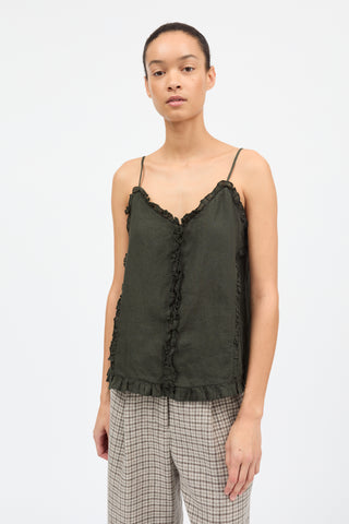 Madeleine Cami Top is a feminine camisole top with single layer ruffles running around the neck and hem and down the front and sides. The frills are neatly finished off with baby-lock stitching and the top hangs from fine roulou loop spaghetti straps that are adjustable for the perfect fit.