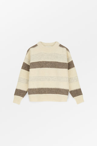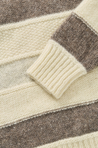 Olga Knit has a beautiful striped pattern, a slightly boxy fit, and is inspired by the colours and craftsmanship of the 1970s. Each stripe is knitted using a different technique – some in garter stitch, others in purl, seed stitch, and rib – creating a lively, handcrafted expression. The stripes are our interpretation of 1970s patchwork, reimagined in light and feminine tones for a modern and timeless look.